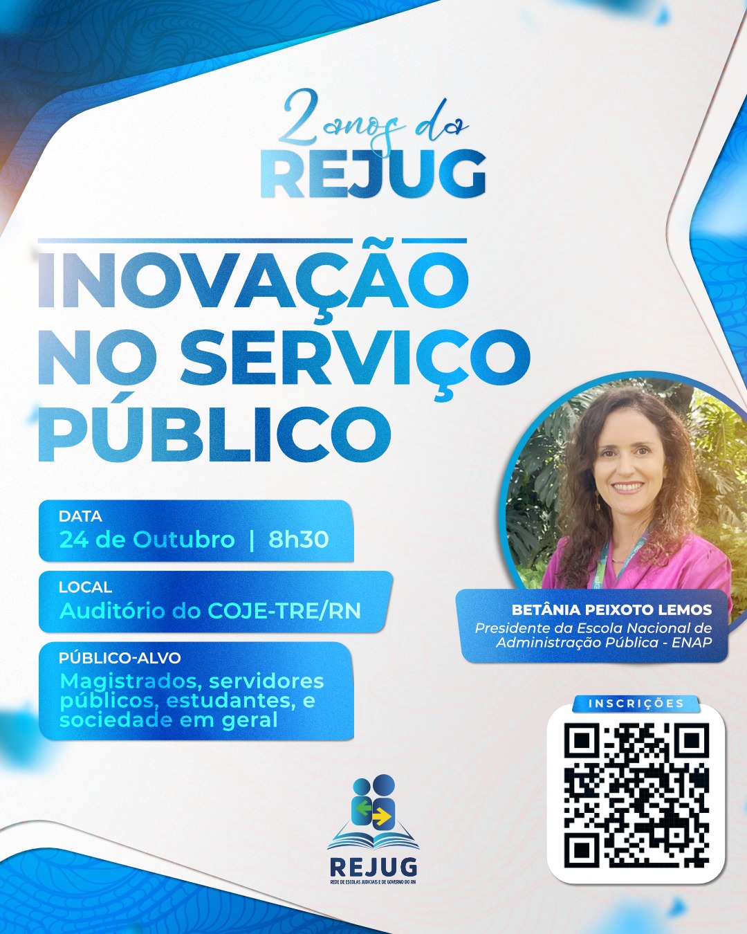 A Rede de Escolas Judiciais e de Governo do Rio Grande do Norte (REJUG-RN) celebra, dois anos de atuação e, para marcar a data, no próximo dia 24, às 8h30, no Centro de Operações do Tribunal Regio nal Eleitoral do Rio Grande do Norte - COJE, haverá a palestra “Inovação no Serviço Público” ministrada pela presidente da Escola Nacional de Administração Pública - ENAP, Betânia Peixoto Lemos, doutora em economia e cuja carreira é focada em formação de profissionais e inovação no serviço público.