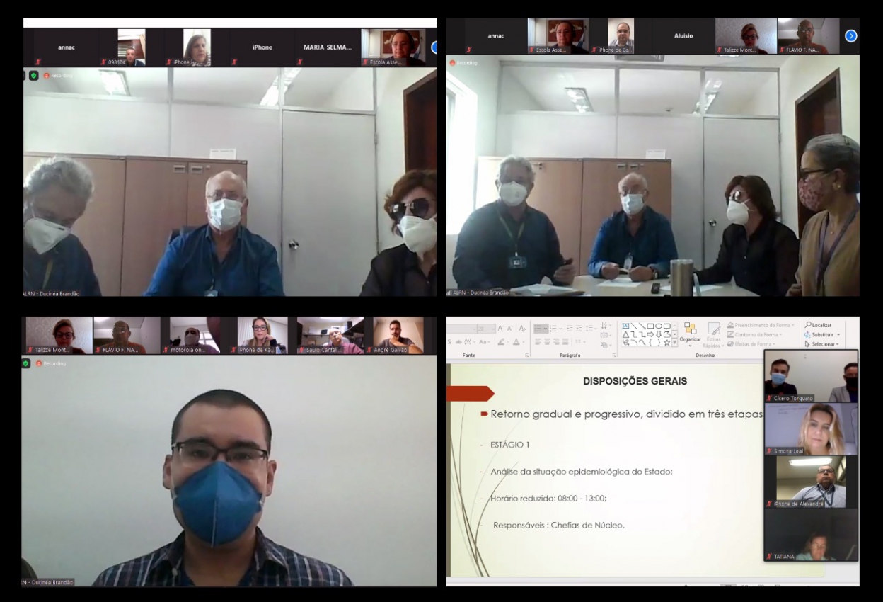 Em mais uma reunião realizada virtualmente, o Comitê de Servidores para Prevenção e Combate à COVID-19 da Assembleia Legislativa do Rio Grande do Norte apresentou o documento de orientações para a retomada dos trabalhos presenciais na Casa. A equipe se reuniu nesta segunda-feira (10), via plataforma Zoom pela Escola da Assembleia, a convite das Diretorias Financeira e Administrativa e a de Políticas Complementares para detalhar as ações. A primeira fase da retomada está prevista para o dia 17 deste mês e as fases subsequentes dependerão dos números da pandemia e resultados obtidos com a retomada.
