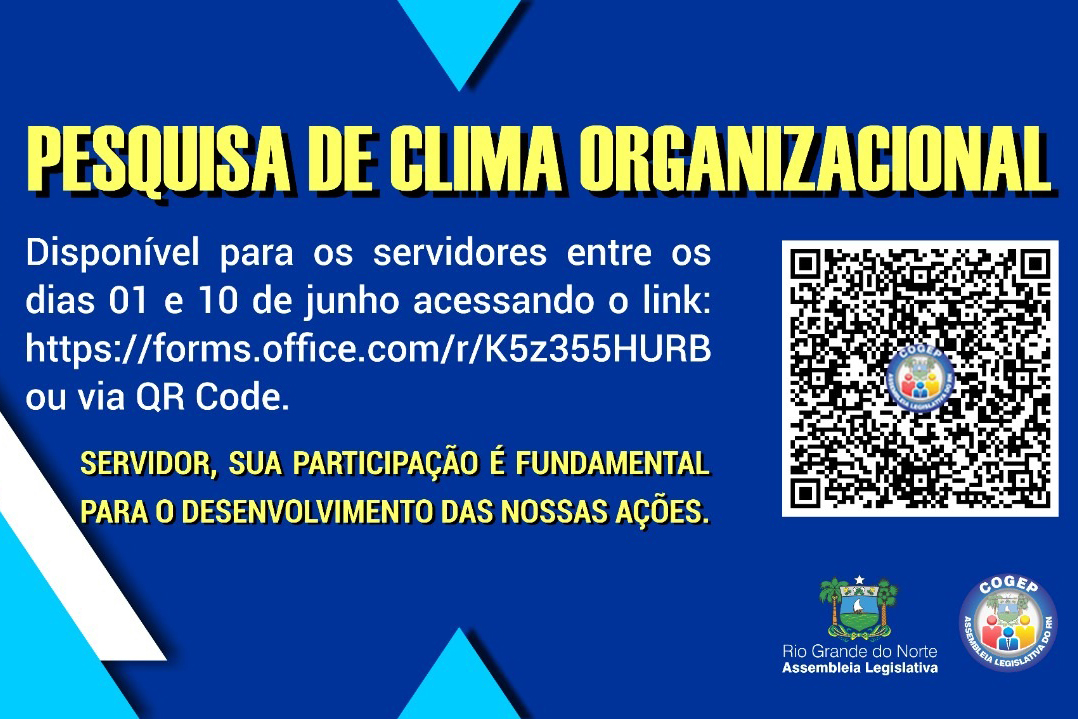 A Coordenadoria de Gestão de Pessoas, por meio do Núcleo de Treinamento, Capacitação e Avaliação de Desempenho (NTCAD), iniciará a partir do dia 01 até 10 de junho, a aplicação da Pesquisa de Clima Organizacional com a participação de todos os servidores desta Casa Legislativa.