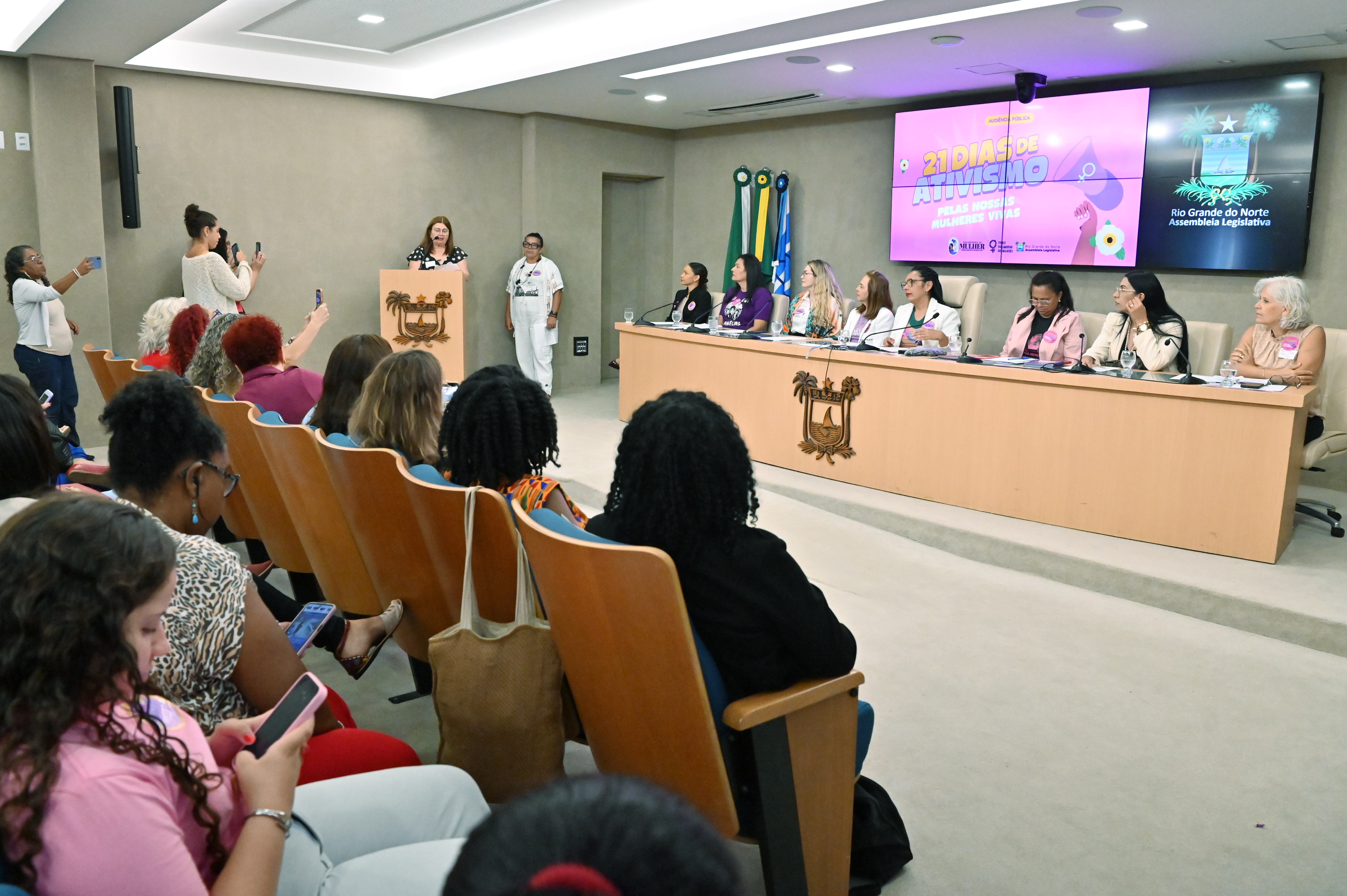 A Assembleia Legislativa do Rio Grande do Norte realizou, na tarde desta terça-feira (9), uma audiência pública no âmbito da Frente Parlamentar da Mulher para discutir o enfrentamento à violência contra as mulheres, dentro da Campanha 21 Dias de Ativismo pelo Fim da Violência contra a Mulher. Proposta pela deputada estadual Divaneide Basílio (PT), a iniciativa reuniu mulheres de diferentes movimentos sociais, representantes de instituições e militantes da pauta de gênero, que relataram casos de violência, dificuldades de acesso à segurança pública e o medo constante que ainda marca a vida de muitas potiguares.